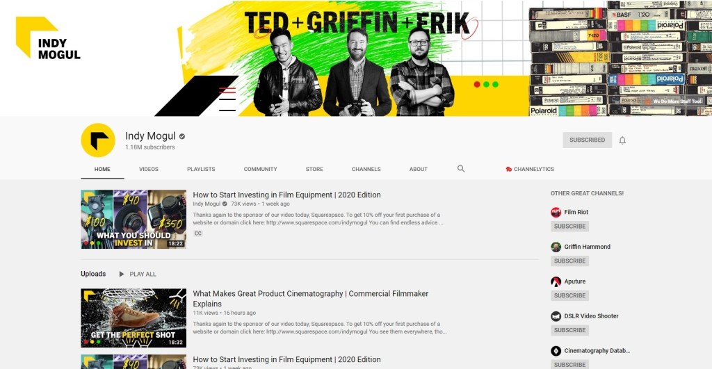 Indy Mogul is a channel hosted by indie filmmakers Ted Sim, Griffin Hammond, and Erik Beck They feature interviews with industry professionals, other creators and put out tons of content on learning filmmaking skills, gear recommendations and more.