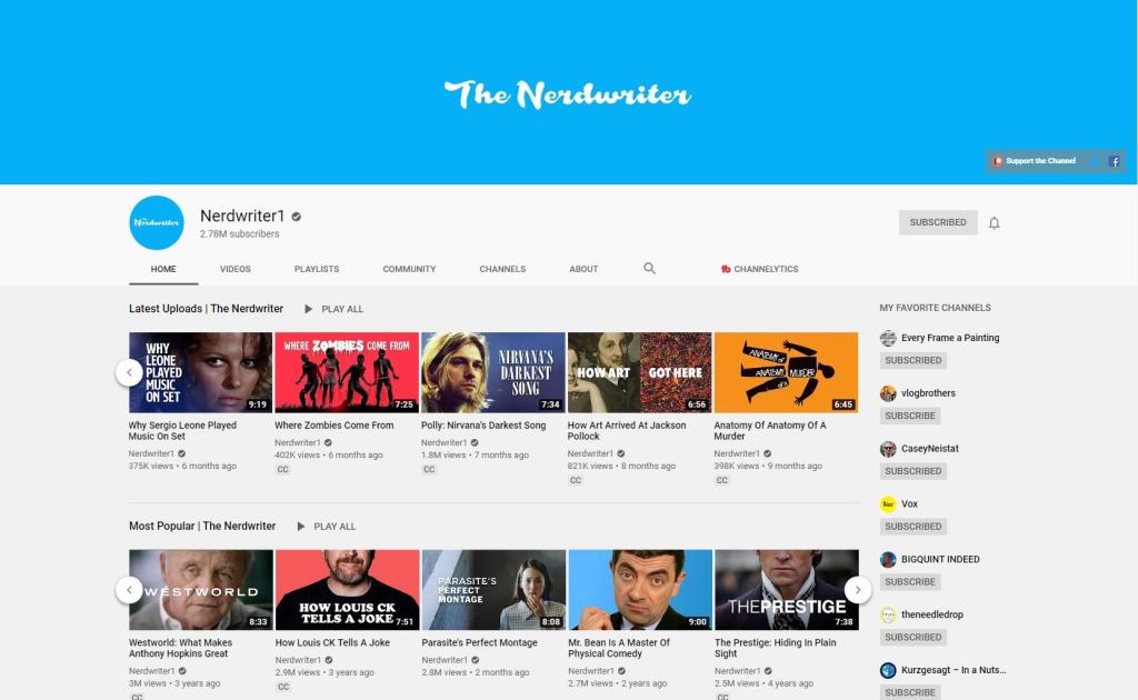 Nerdwriter is a video essay channel created by Evan Puschak, an American journalist who worked with MSNBC as a multimedia editor.